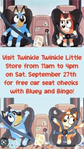 Visit Twinkle Twinkle Little Store from 11am – 4pm for National Seat Check Saturday with Bluey and Bingo! This event, which is part of Child Passenger Safety Week (September 21-27, 2025), offers free car seat checks from certified technicians to ensure proper installation and use for children’s safety. Your favorite animated dogs, Bluey and Bingo, will also be in attendance to visit the kids. Kids are also welcome to come in and enjoy the free, air-conditioned 4 level playground in store. No appointment required for this event.