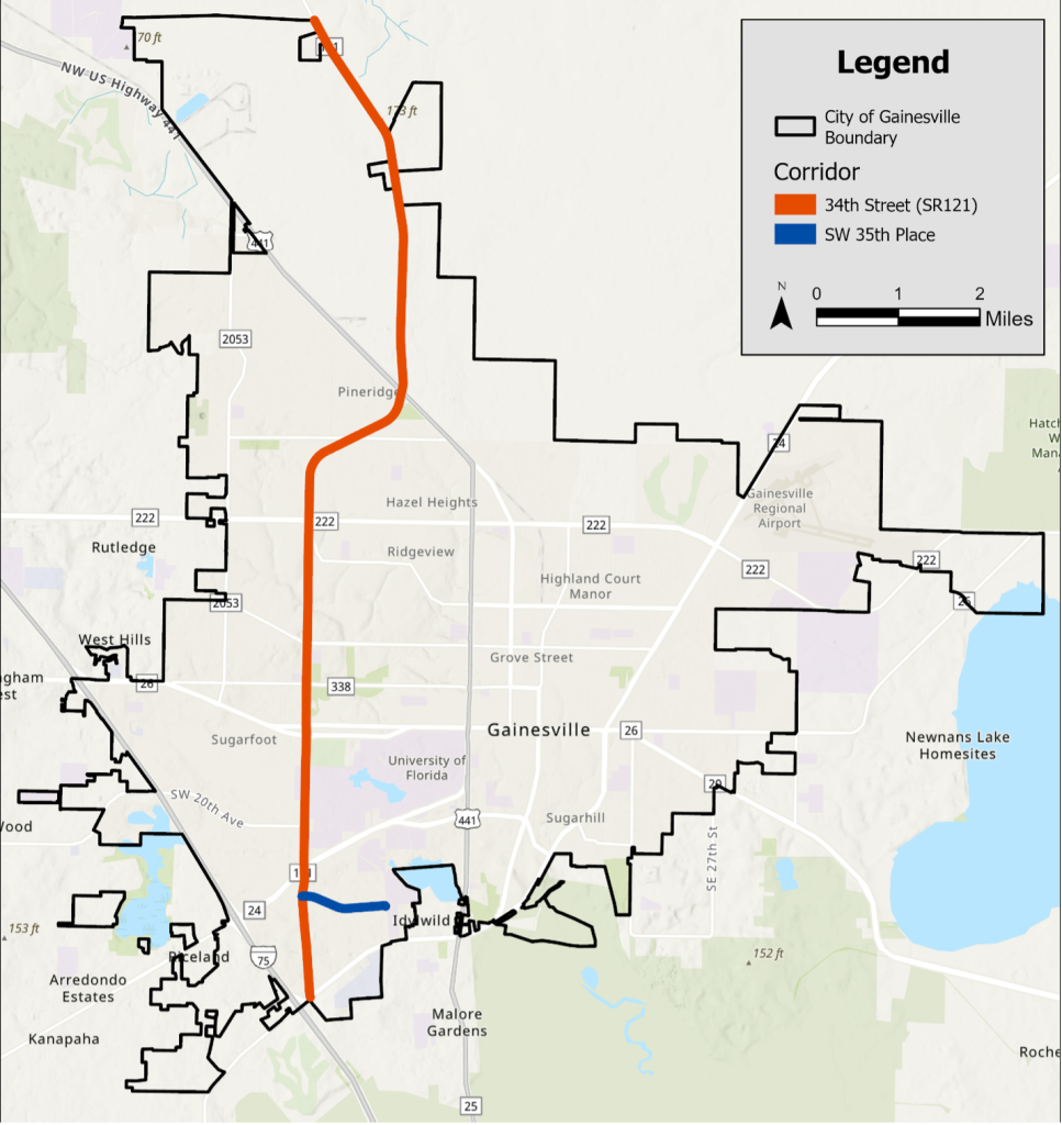 The SR-121 (34th Street) and SW 35th Place corridors are critical connectors for students, faculty, and residents navigating Gainesville’s urban core. They pass through areas with dense off-campus housing, commercial activity, and high multimodal travel demand, making their safety performance especially important.